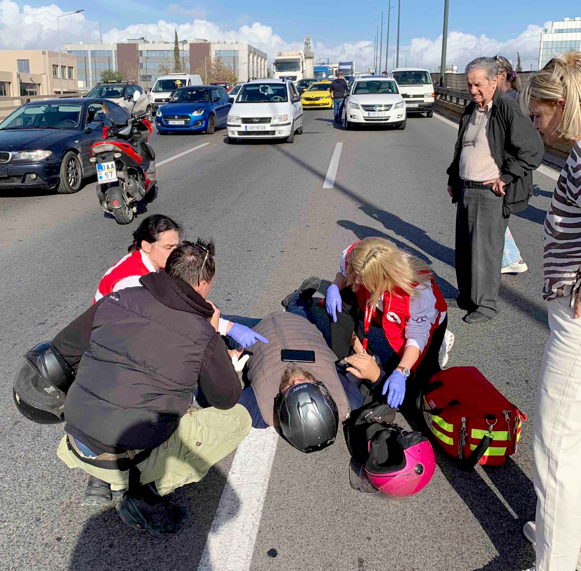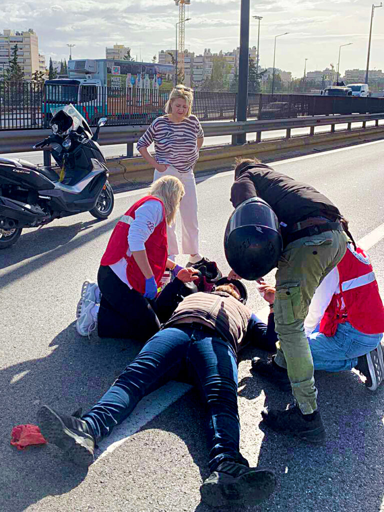 Την Τετάρτη, νωρίς το μεσημέρι, κλιμάκιο νοσηλευτικού προσωπικού του Ελληνικού Ερυθρού Σταυρού, το οποίο επέστρεφε με υπηρεσιακό όχημα από αιμοδοσία του Ε.Ε.Σ., παρενέβη άμεσα σε τροχαίο ατύχημα με τραυματισμό οδηγού μηχανής, στη Λεωφόρο Κηφισού.