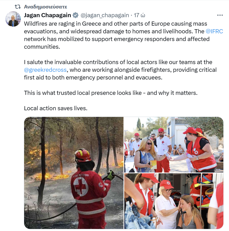 Ο Γενικός Γραμματέας της Διεθνούς Ομοσπονδίας Συλλόγων Ερυθρού Σταυρού & Ερυθράς Ημισελήνου στην Γενεύη, Jagan Chapagain, συγχαίρει ξανά, με δημόσια ανάρτησή του, το έργο του Ε.Ε.Σ. και των ακούραστων εθελοντών του για την αντιμετώπιση των καταστροφικών πυρκαγιών και του πρόσφατου καύσωνα.