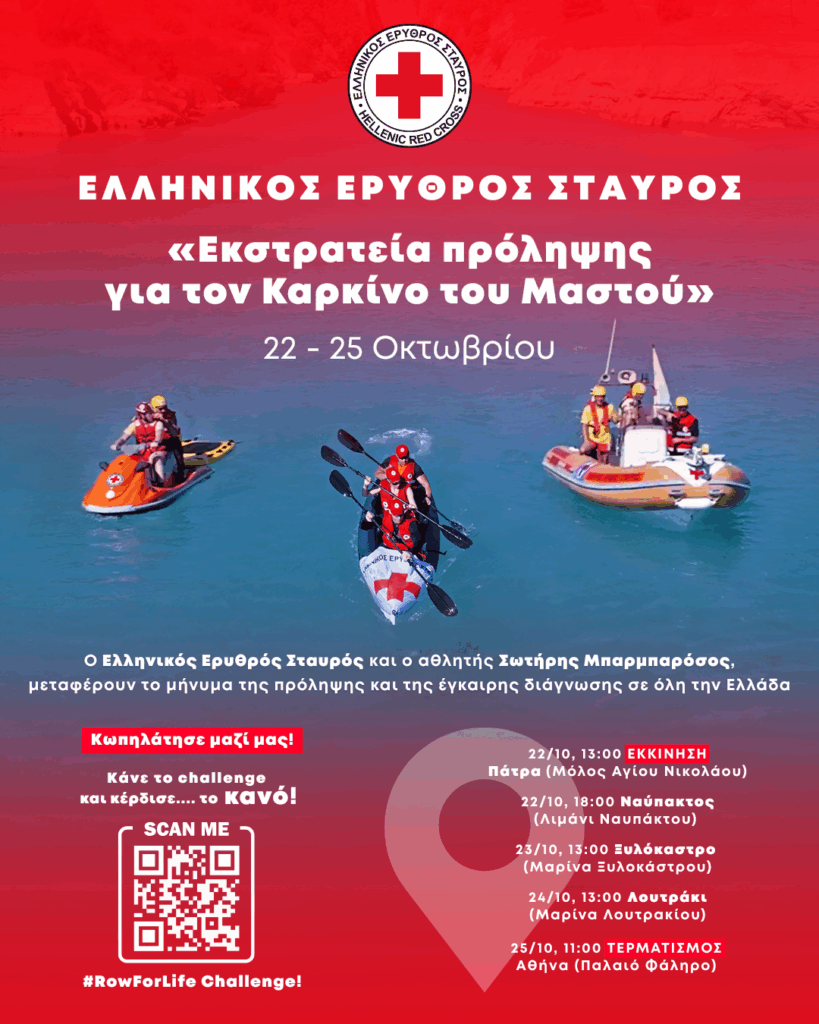 Ο Ελληνικός Ερυθρός Σταυρός ενώνει τις δυνάμεις του με τον αθλητή μεγάλων αποστάσεων Σωτήρη Μπαρμπαρόσο και κωπηλατεί από την Πάτρα έως την Αθήνα, μεταφέροντας ένα μήνυμα ελπίδας, δύναμης και πρόληψης για τον καρκίνο του μαστού. Η δράση πραγματοποιείται με αφορμή την Παγκόσμια Ημέρα Κατά του Καρκίνου του Μαστού και έχει ως στόχο να υπενθυμίσει ότι μια απλή εξέταση μπορεί να σώσει μια ζωή.